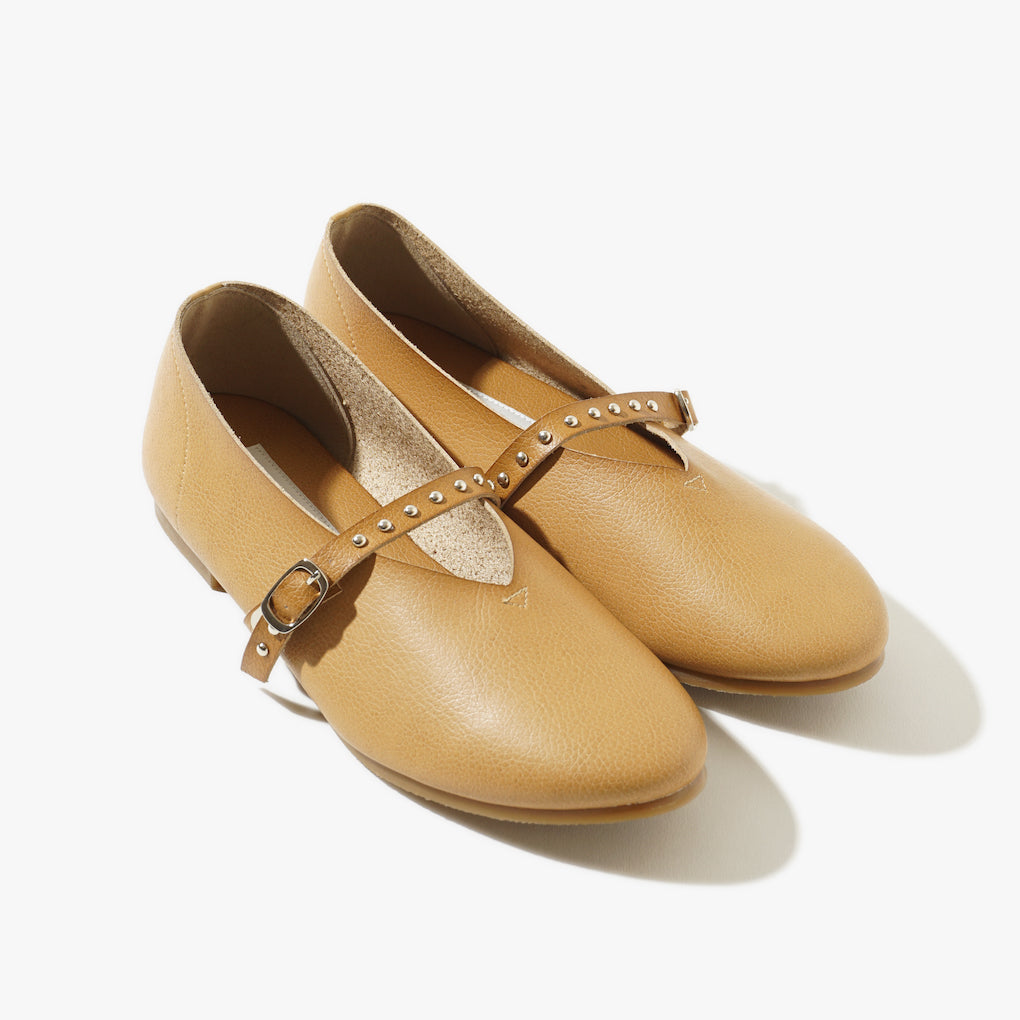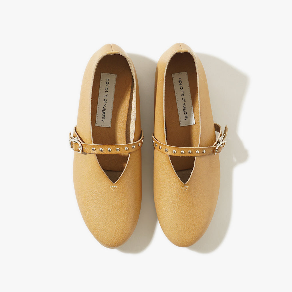 アッパーにヴィーガンレザーを使用したスタッズストラップシューズ。ストラップもスナップボタン仕様のため脱着も楽です。
