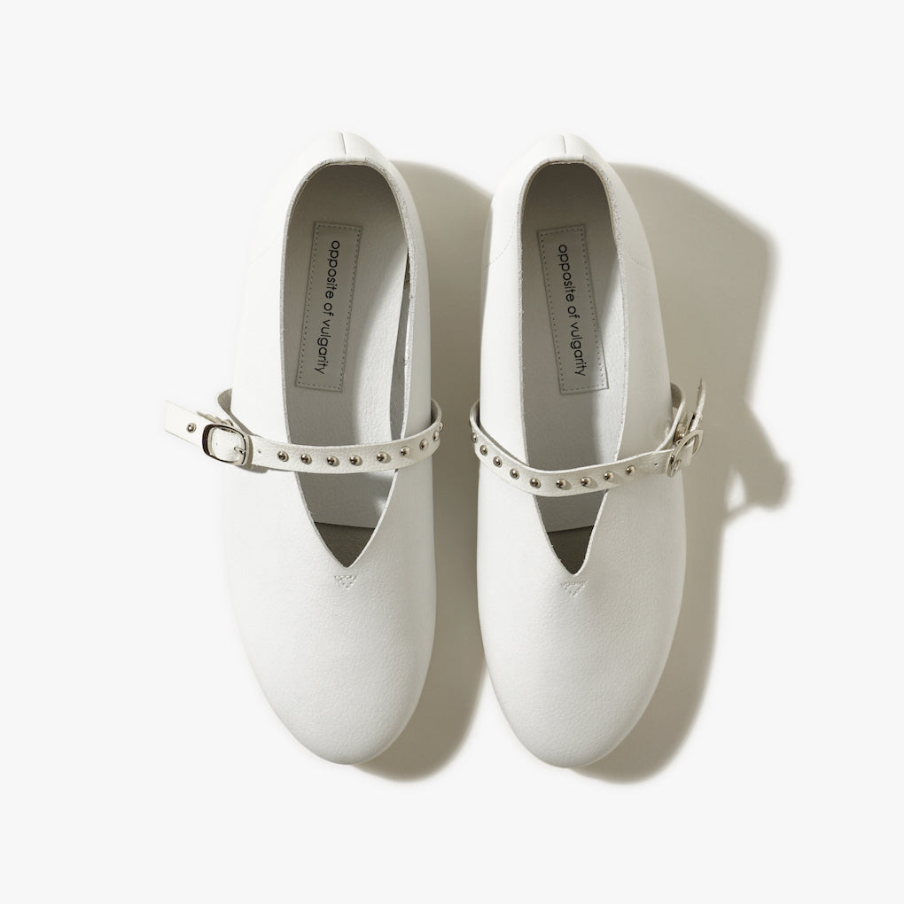 アッパーにヴィーガンレザーを使用したスタッズストラップシューズ。ストラップもスナップボタン仕様のため脱着も楽です。