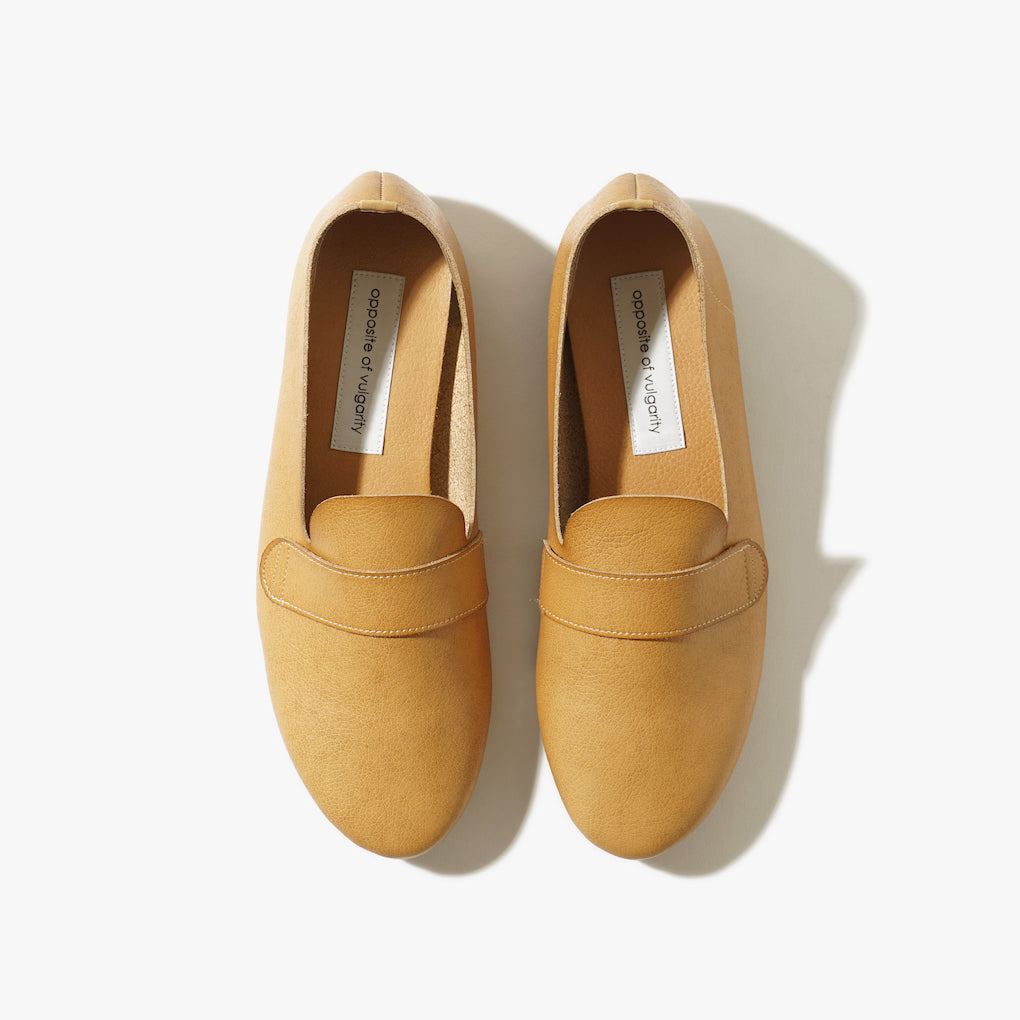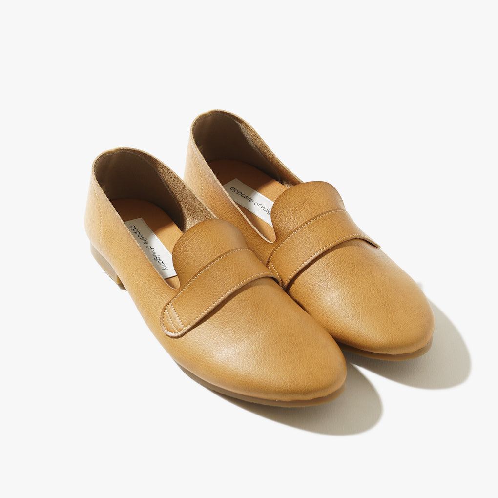 アッパーにヴィーガンレザーを使用し甲にバンドを施したシンプルなスリッポン。様々なスタイルに対応できる実用的な1足です。